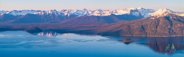 An expansive panoramic view of Frederick Sound and the snow-capped Coast Range bathed in soft evening light. The tranquil waters mirror the rugged peaks and forested slopes of Southeast Alaska, capturing the serene beauty of this remote wilderness near Mitkof Island and Petersburg. A breathtaking landscape showcasing Alaska’s natural grandeur and calm coastal magic.