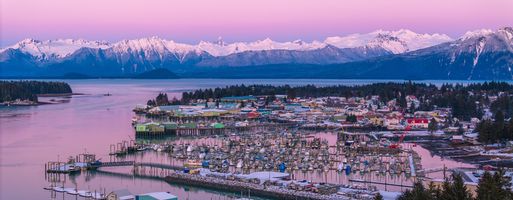 A stunning aerial winter panorama of Petersburg, Alaska, where snow-covered boats rest quietly in the harbors beneath a pastel Alaskan sunset. The Coast Range mountains glow in soft pink and lavender hues as twilight settles over Frederick Sound and Mitkof Island. This peaceful scene captures the stillness and charm of Alaska’s “Little Norway” in winter light.