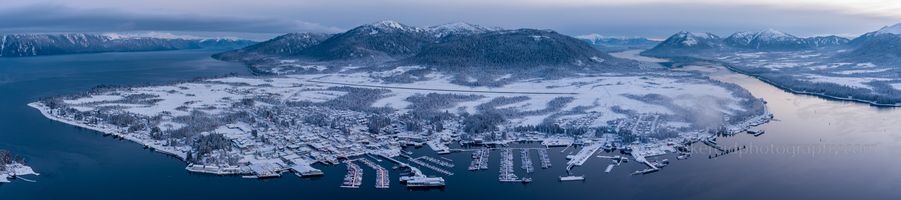 A sweeping aerial panorama of Petersburg, Alaska, blanketed in fresh snow along the shores of Wrangell Narrows and Frederick Sound. Fishing boats rest quietly in the icy harbors, surrounded by snow-covered forests and distant peaks of the Coast Range. This peaceful winter view captures the remote beauty and maritime spirit of Alaska’s “Little Norway” from above.