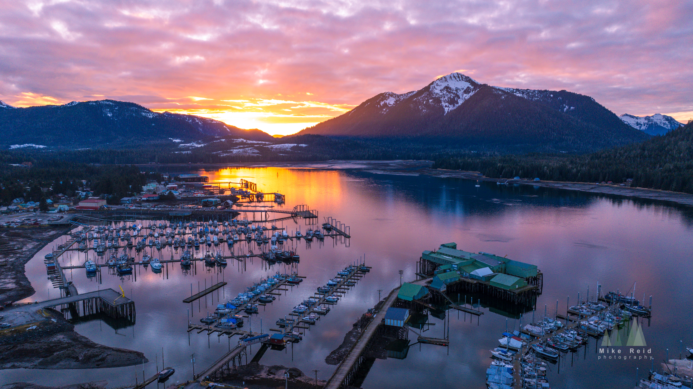 Petersburg Alaska Sunset Sunrays Clouds Marina Aerial.jpg
