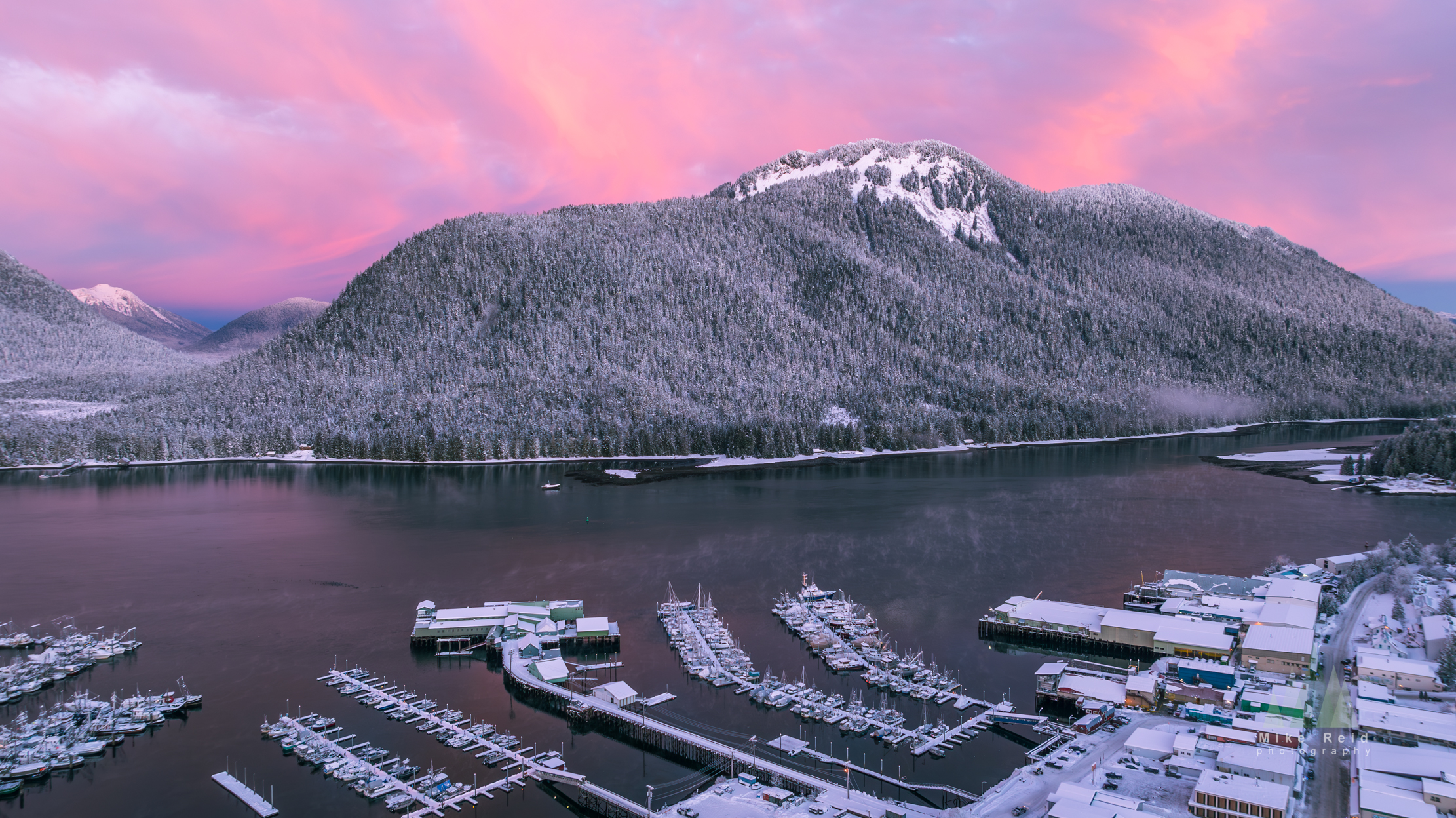 Petersburg Alaska Sunset Winter Snowcovered Marina Aerial.jpg