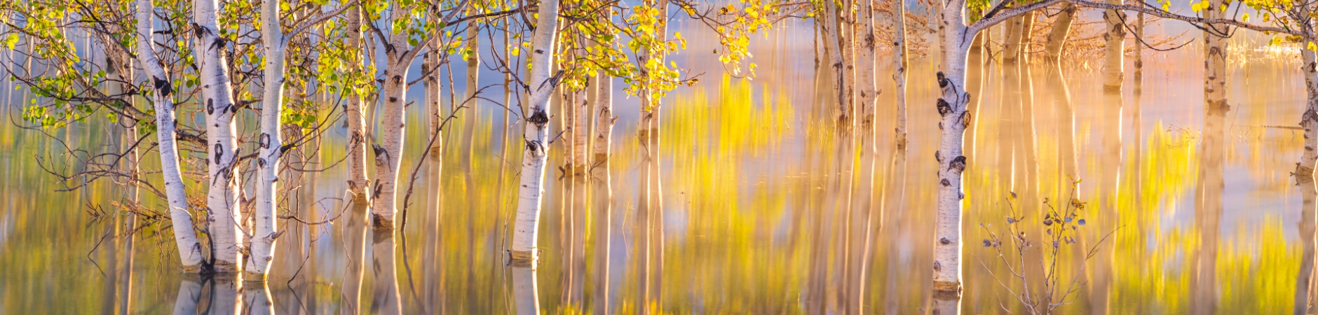 A serene fine art photograph of sunken aspen trees glowing in golden fall colors, captured with the Fujifilm GFX100S. Gentle light filters through the vibrant leaves, reflecting off still waters to create a dreamlike, painterly composition. The mirrored trunks and soft hues evoke peace, renewal, and the quiet beauty of nature’s changing seasons — perfect for collectors of high-resolution fine art landscapes.
