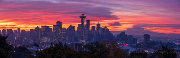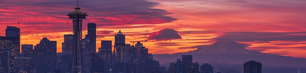 A breathtaking Seattle sunrise mid Panorama captured from iconic Kerry Park, showcasing the Space Needle, downtown skyline, and distant Mount Rainier bathed in vivid hues of red, orange, and purple. This fine art photograph highlights the magic of early morning light as it illuminates the city and clouds in a spectacular Pacific Northwest display.