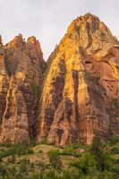 Towering sandstone cliffs glow with rich golden light in this view of Zion National Park, Utah. The intricate vertical patterns and natural columns reveal the timeless artistry of erosion and desert sun. As the day fades, warm hues of amber, rust, and gold bring these monumental canyon walls to life — a breathtaking display of Zion’s ancient geology and radiant light.