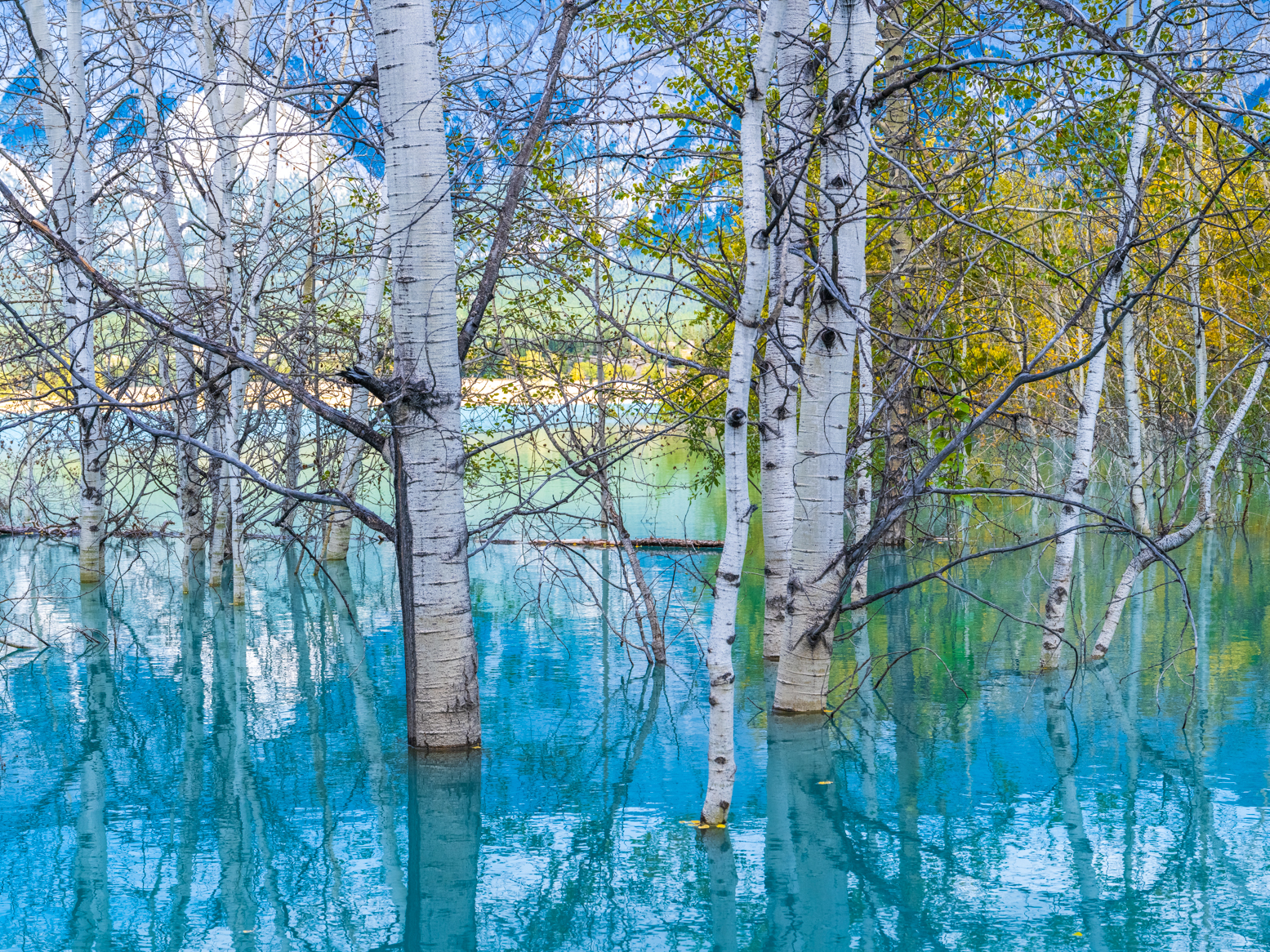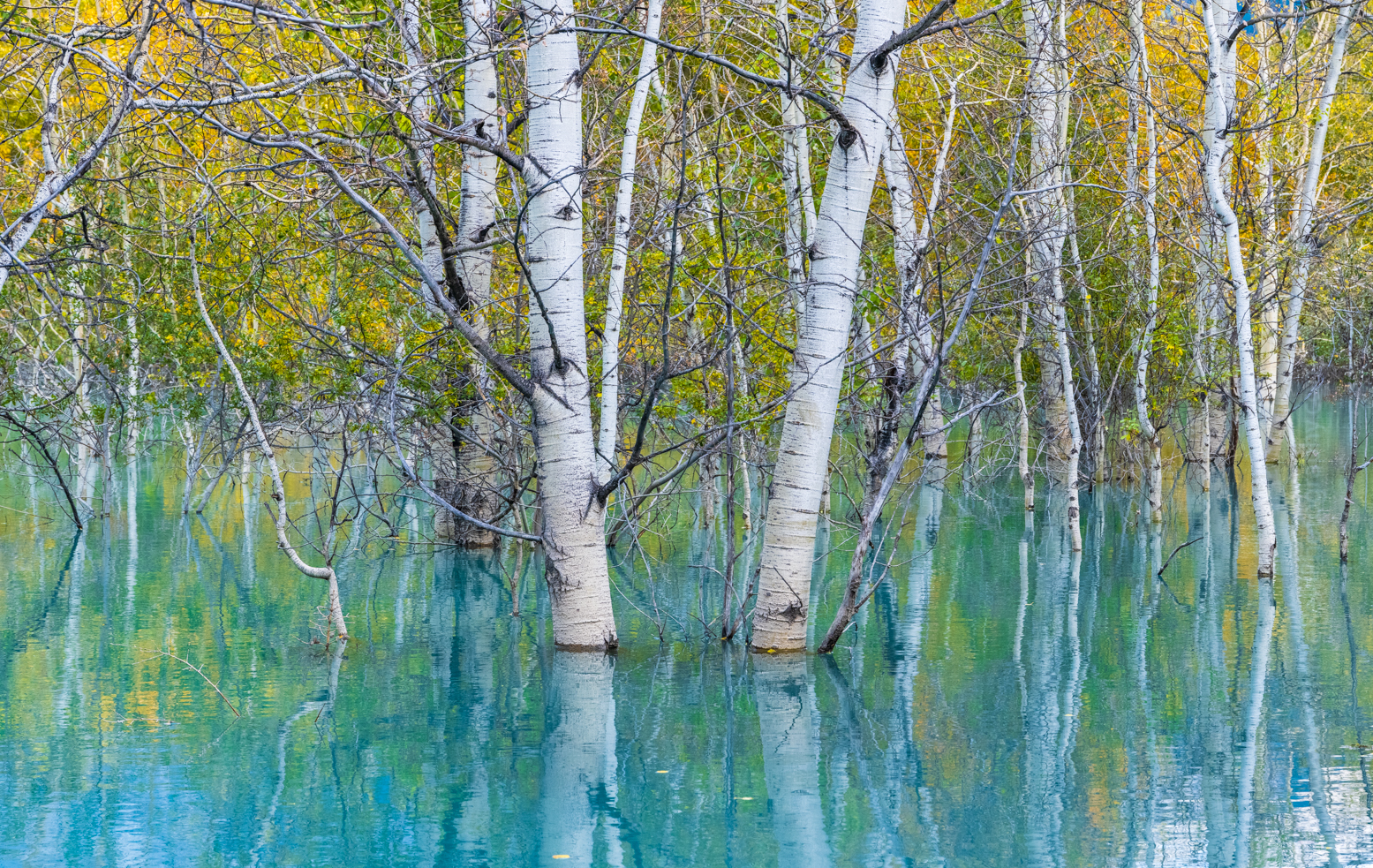 An intimate fine art photograph of slender aspens rising from turquoise water, their white trunks mirrored in a calm reflective pool. Captured with the Fujifilm GFX100S, this peaceful scene highlights the quiet interplay of autumn gold and cool aquamarine tones. A soothing, painterly composition that brings nature’s balance and color harmony to any fine art collection or décor.
