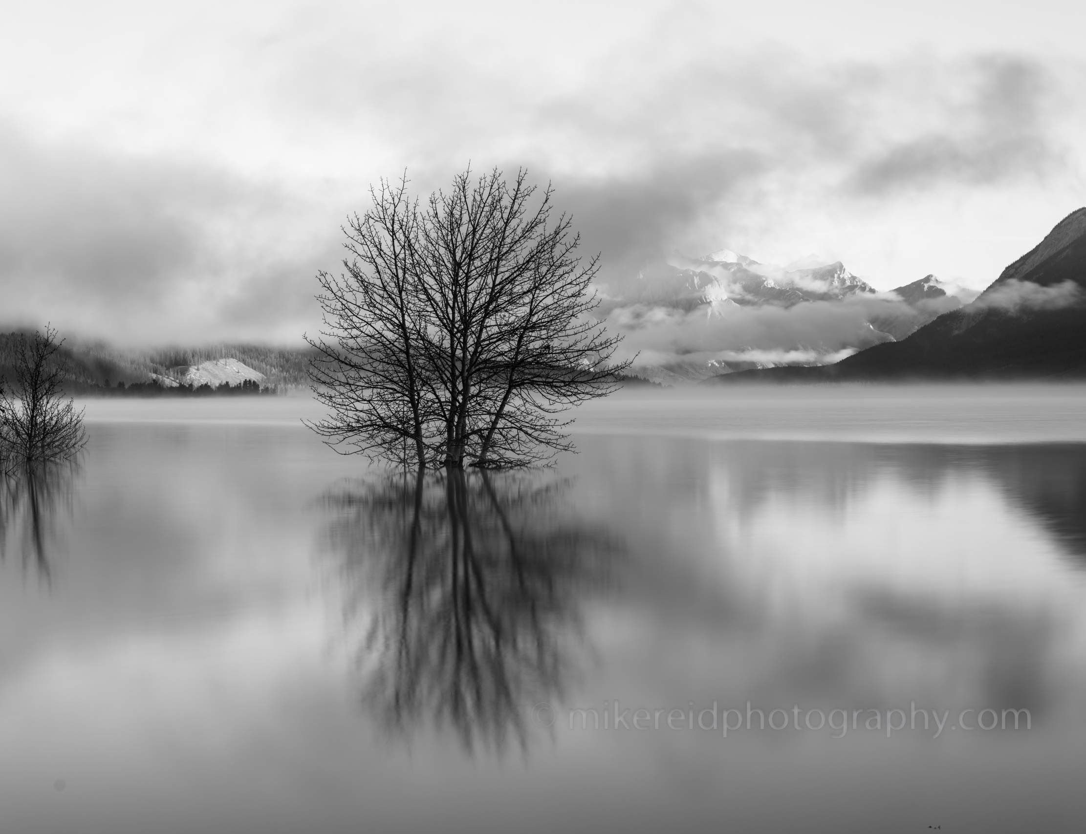 A solitary tree rises from the calm surface of an Alberta lake, mirrored perfectly in still water beneath soft clouds and distant mountain peaks. This black-and-white fine art photograph captures the serenity and balance of nature through pure tonal contrast and reflection symmetry. Shot in Alberta with medium-format precision, the image blends simplicity, emotion, and timeless beauty — ideal for modern wall art collectors.