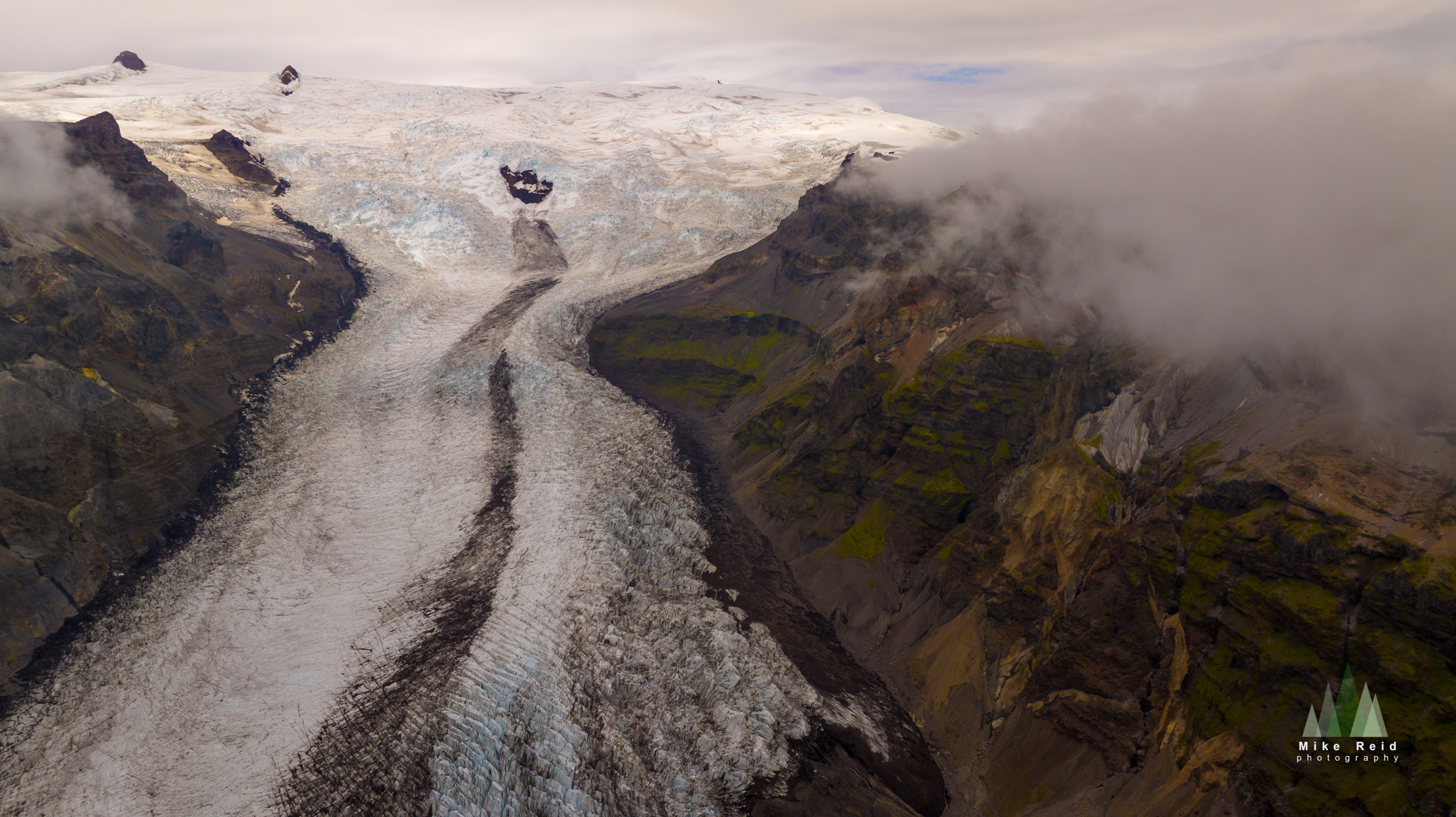 This dramatic aerial photograph captures a glacier carving its path through Iceland’s rugged mountain landscape, creating what appears to be a natural “road” of ice and rock. The contrasting textures of deep crevasses, snow, and volcanic cliffs reveal the raw power and slow movement of nature’s sculpting forces. Clouds drift along the ridges, adding mystery and depth to the scene. A powerful fine art print that celebrates the grandeur and resilience of Iceland’s glaciers, perfect for collectors inspired by wilderness and geological wonder.