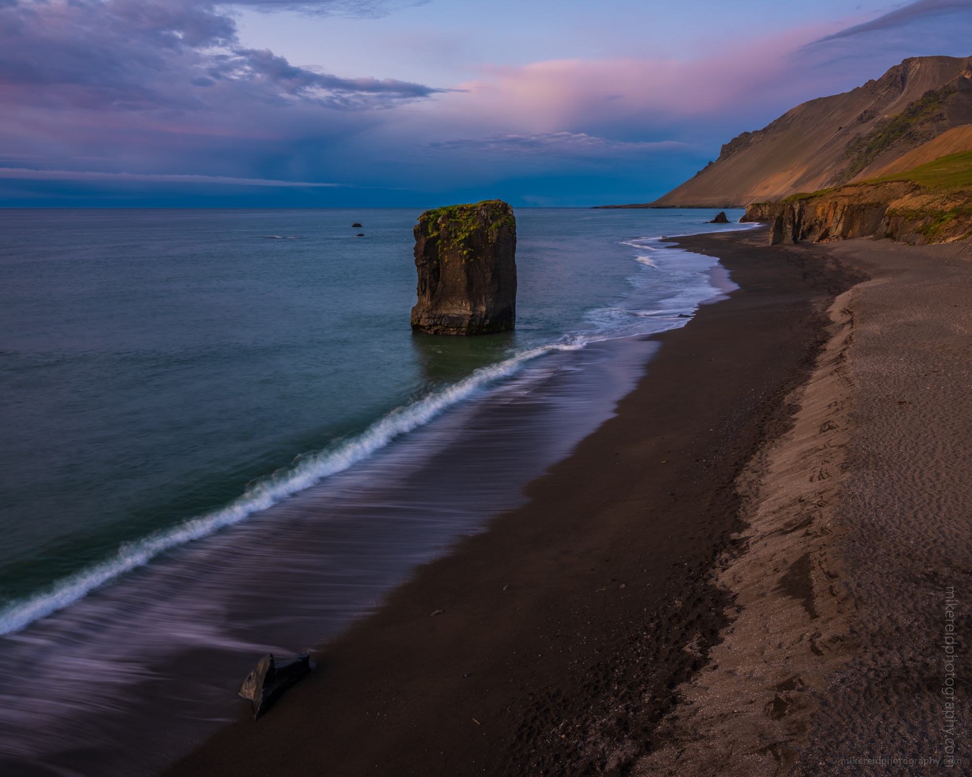 A serene evening view along Iceland’s dramatic South Coast, featuring a solitary sea stack rising from the Atlantic beside dark volcanic sands. Captured with the Fuji GFX50s medium-format camera, this fine art landscape photograph highlights the soft pastel hues of twilight, gentle waves, and the rugged coastal cliffs that define Iceland’s wild shoreline. Perfect for collectors seeking the tranquil beauty of Icelandic seascapes in print.