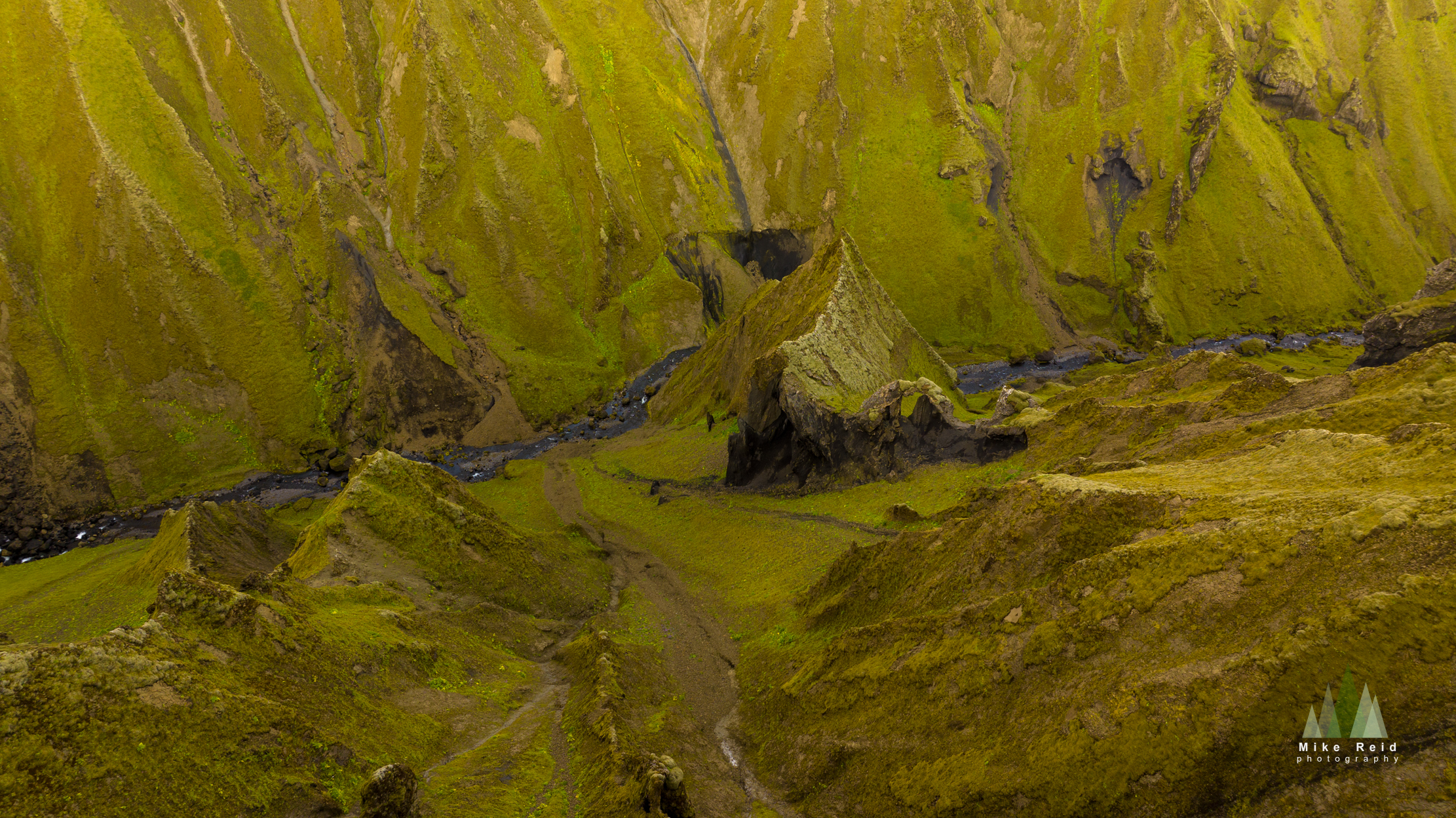 This striking photograph captures the dramatic landscape of Þakgil (Thakgil), Iceland, featuring the sharp, dragon-tooth-shaped peak rising above a winding canyon river. Lush moss blankets the steep volcanic walls, creating vivid green textures that contrast beautifully with the dark basalt formations below. The scene evokes the raw, untouched beauty of Iceland’s southern highlands—a place where imagination meets geology. A powerful fine art print for lovers of Icelandic landscapes, wilderness exploration, and nature’s sculpted forms.