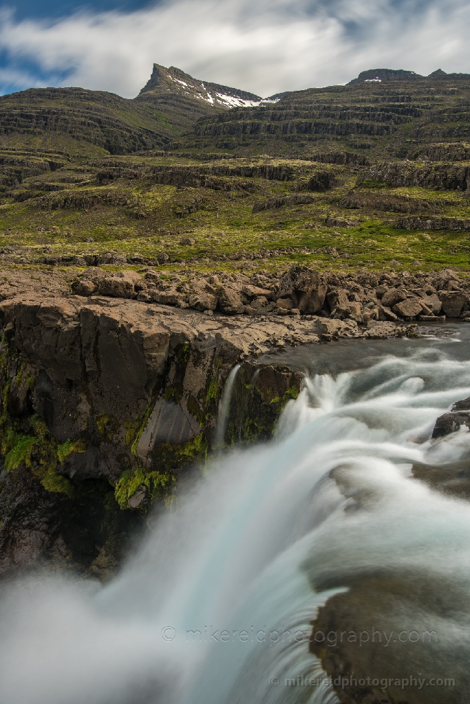 Powerful cascades of Fossárdalur Falls plunge through rugged volcanic rock and emerald moss in Iceland’s eastern highlands. Captured by Mike Reid Photography, this fine art landscape photograph showcases the timeless energy and natural beauty of Iceland’s wild terrain, where glacial meltwater carves through dramatic basalt formations under shifting skies.
