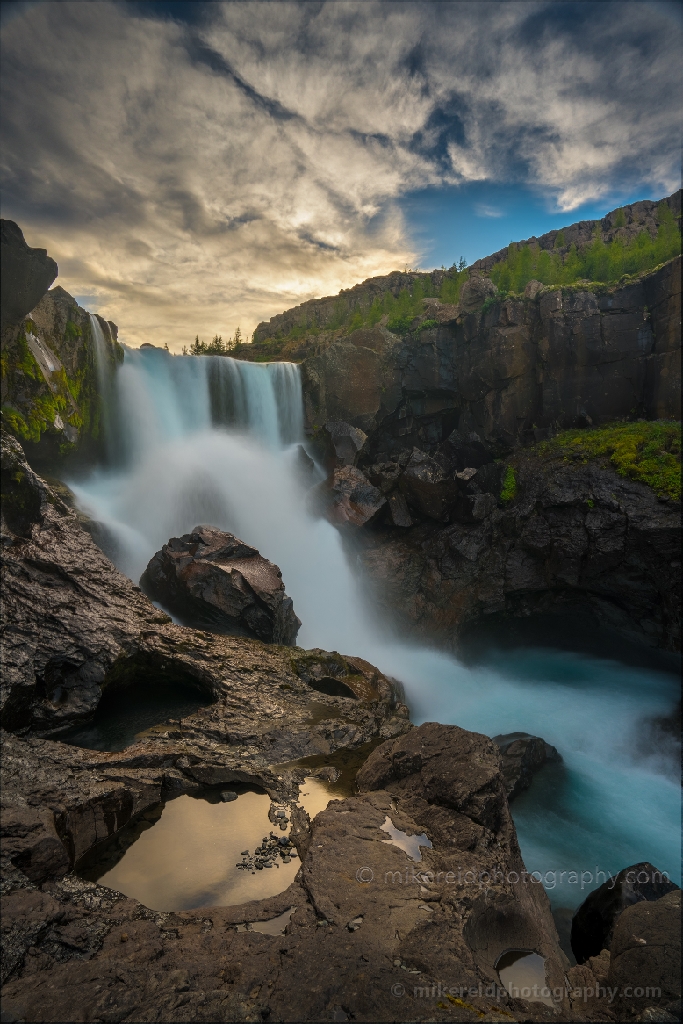 Sunset light glows across Fossárdalur Falls in Iceland, with golden reflections shimmering in rock pools beneath the cascading water. Captured under dramatic evening skies, this fine art landscape photograph by Mike Reid Photography highlights the power and serenity of Iceland’s waterfalls framed by rugged cliffs and tranquil reflections.