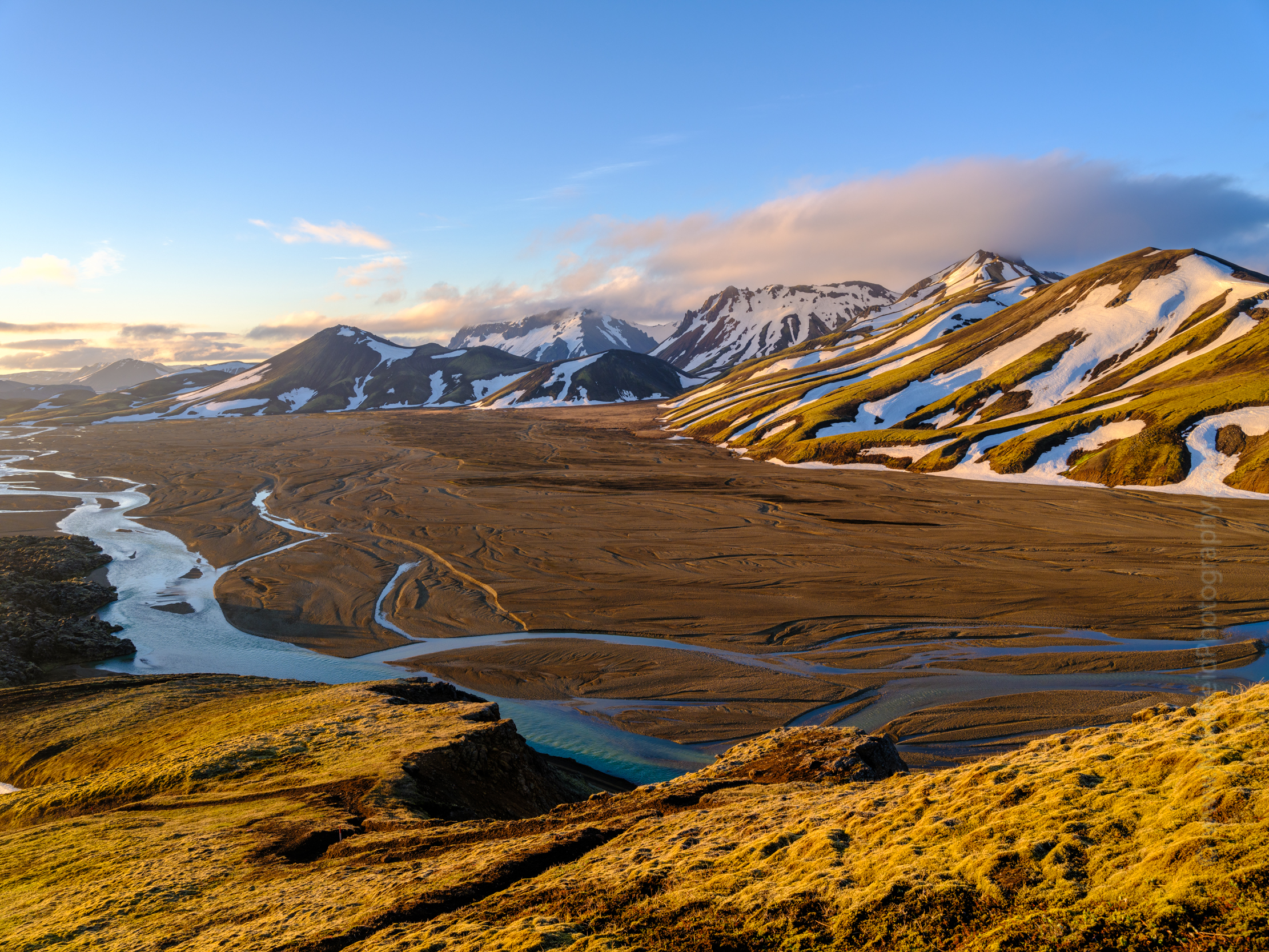 Golden morning light brushes across Barmur Ridge and the winding Jökulgilskvísl River, seen from the Sudurnámur hiking ridge in Iceland’s Highlands. Captured by Mike Reid Photography in May, this landscape reveals snow-streaked rhyolite peaks, glacial rivers, and early summer hues glowing beneath a clear Arctic sky — an iconic Landmannalaugar vista of Iceland’s untamed beauty.