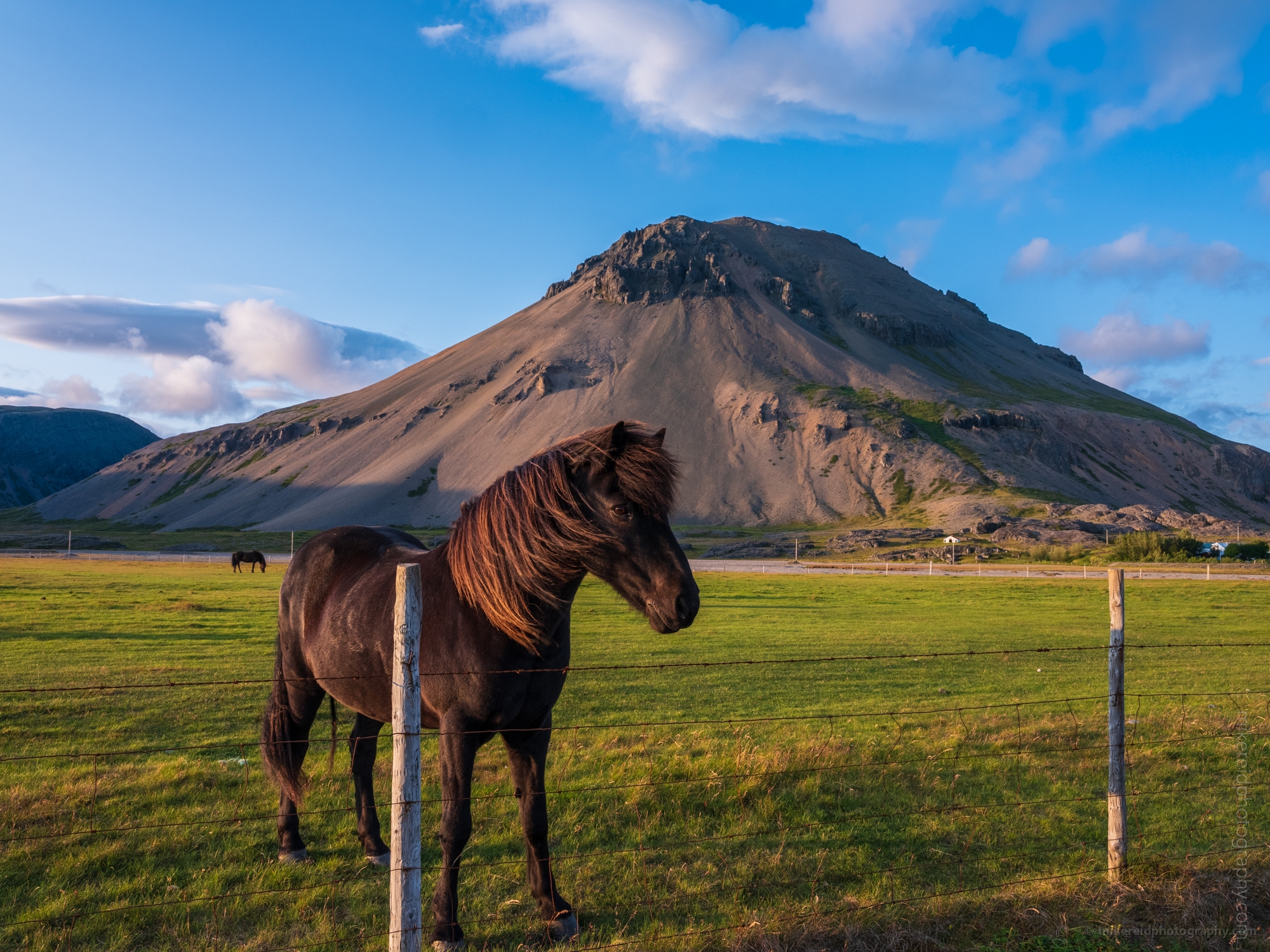 A majestic Icelandic horse stands in the soft glow of evening light against a dramatic volcanic mountain backdrop. Captured in the serene countryside of Iceland, this fine art photograph reveals the quiet strength and beauty of one of Iceland’s most iconic animals. The Fuji GFX50s medium-format camera captures every detail—from the horse’s flowing mane to the texture of the rugged slopes beyond—celebrating Iceland’s harmony between nature, landscape, and life.