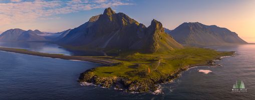 This stunning panoramic photograph showcases Iceland’s Hvalnes Peninsula and the dramatic Eystrahorn mountain, glowing in the warm light of sunset. The rugged coastal cliffs, black sand shoreline, and deep blue Atlantic waters contrast beautifully with the green meadows and golden tones of the evening sky. The bright orange Hvalnes lighthouse stands as a striking focal point beneath the jagged volcanic peaks. A captivating fine art print celebrating the wild beauty of southeast Iceland’s coast and one of its most iconic mountain landscapes.