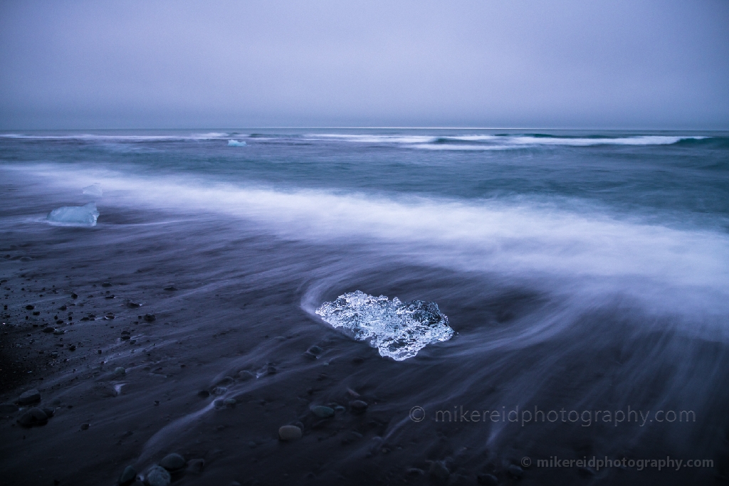 A serene long-exposure photograph of a crystal-clear iceberg resting on Iceland’s famous Jökulsárlón Ice Beach. Gentle waves wash over the black volcanic sand, creating smooth streaks of motion and a dreamlike atmosphere under soft twilight light. Captured by Mike Reid Photography, this fine art print showcases the striking contrast between ice, ocean, and sand—an ethereal moment from Iceland’s south coast.