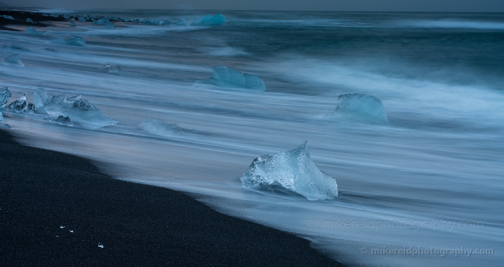 Smooth waves sweep over luminous ice fragments resting on the black sands of Diamond Beach near Jökulsárlón Glacier Lagoon in Iceland. Captured in long exposure, the scene blends motion and stillness as glacial ice contrasts beautifully with the dark shoreline and soft ocean hues. A fine art photograph by Mike Reid Photography, showcasing the tranquil and ever-changing rhythm of Iceland’s coastal wilderness.