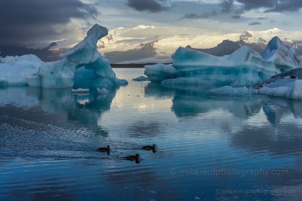 Three birds glide across the still, blue waters of Jökulsárlón Glacier Lagoon at dawn, framed by luminous icebergs and distant glacier peaks. Captured by Mike Reid Photography, this serene fine art landscape photograph captures the peaceful rhythm of Iceland’s wild beauty as light and reflection meet in harmony.