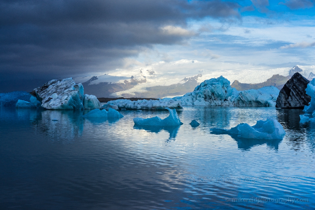 Dark storm clouds roll above the glowing blue icebergs of Jökulsárlón Glacier Lagoon in Iceland, where glacial tones meet dramatic northern light. Captured by Mike Reid Photography, this fine art landscape photograph reveals the contrast between moody skies and luminous reflections — a timeless moment of Iceland’s wild and sculpted beauty.