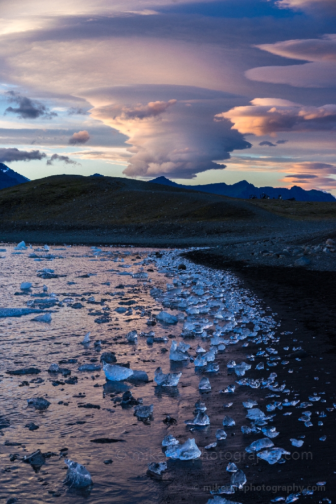 A dramatic sunset unfolds over Iceland’s Jökulsárlón Glacier Lagoon as lenticular clouds swirl above a shoreline strewn with crystal-blue ice. Each fragment glows in the fading light, reflecting the pastel sky across the dark volcanic sand.