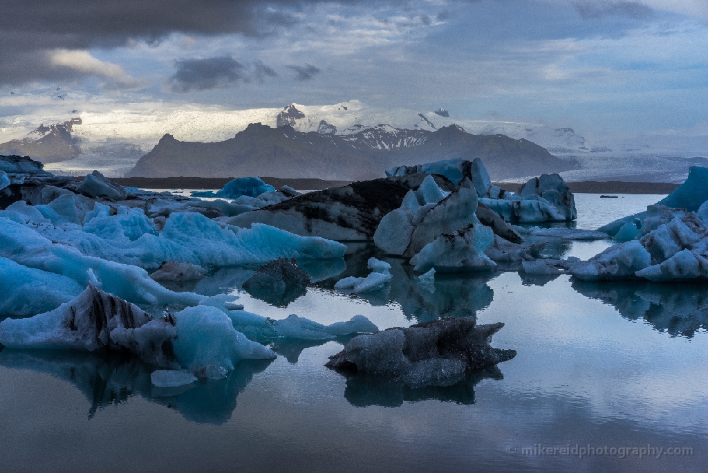 Layers of blue icebergs float silently in Iceland’s Jökulsárlón Glacier Lagoon beneath overcast skies, reflecting the vast Vatnajökull Glacier in the distance. The deep tones and mirrored stillness convey both fragility and power within Iceland’s frozen landscapes. Fine-art photograph by Mike Reid capturing the atmospheric beauty of the Arctic light.
