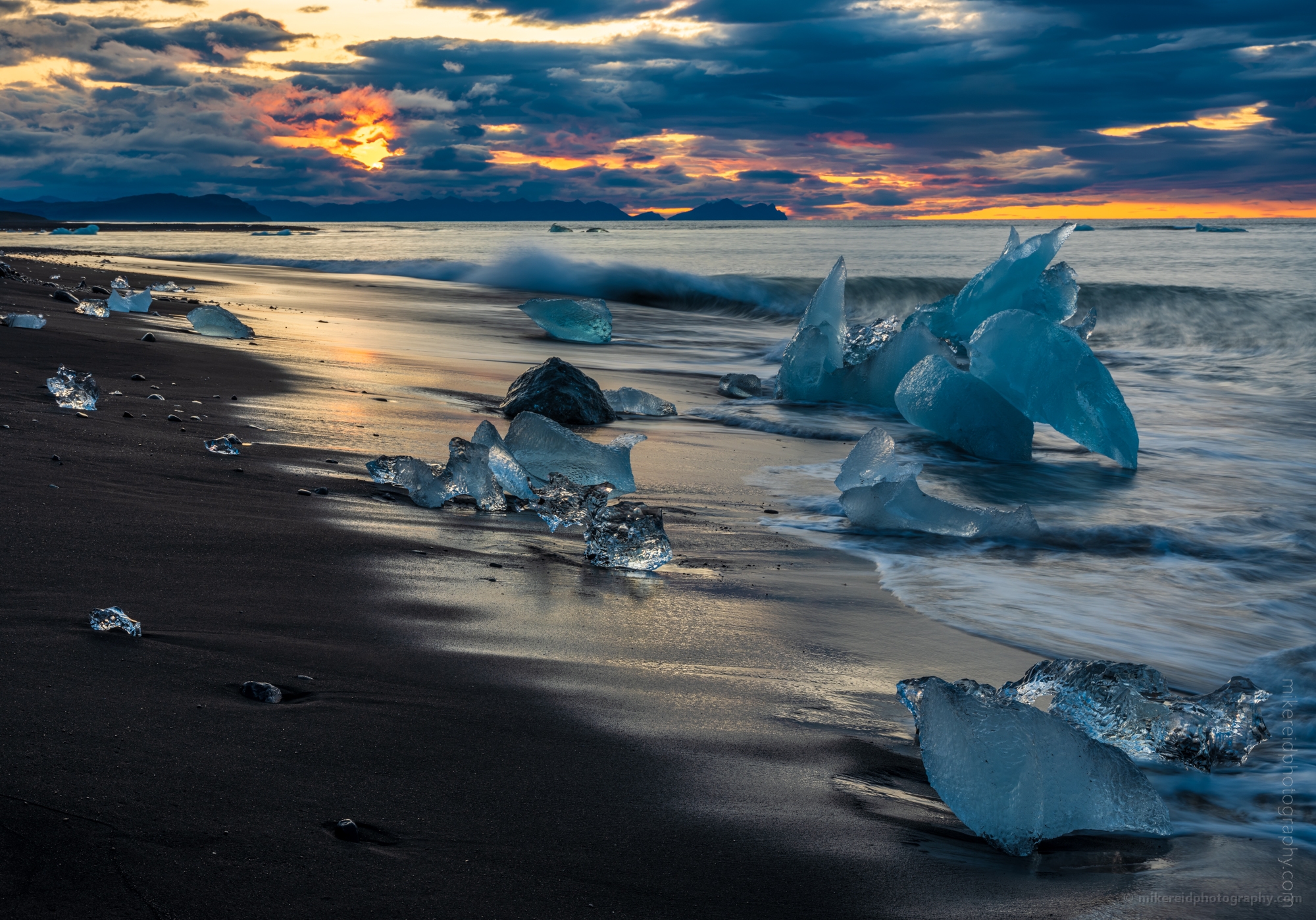 Brilliant blue icebergs rest on the black volcanic sands of Diamond Beach as the first light of sunrise ignites the clouds over Iceland’s South Coast. This fine art seascape captures the luminous contrast between glowing ice, dark shoreline, and the fiery horizon beyond Jokulsarlon Glacier Lagoon. A stunning moment of Icelandic beauty where ice, ocean, and sky merge in color and motion—perfect for collectors of dramatic coastal and nature photography.