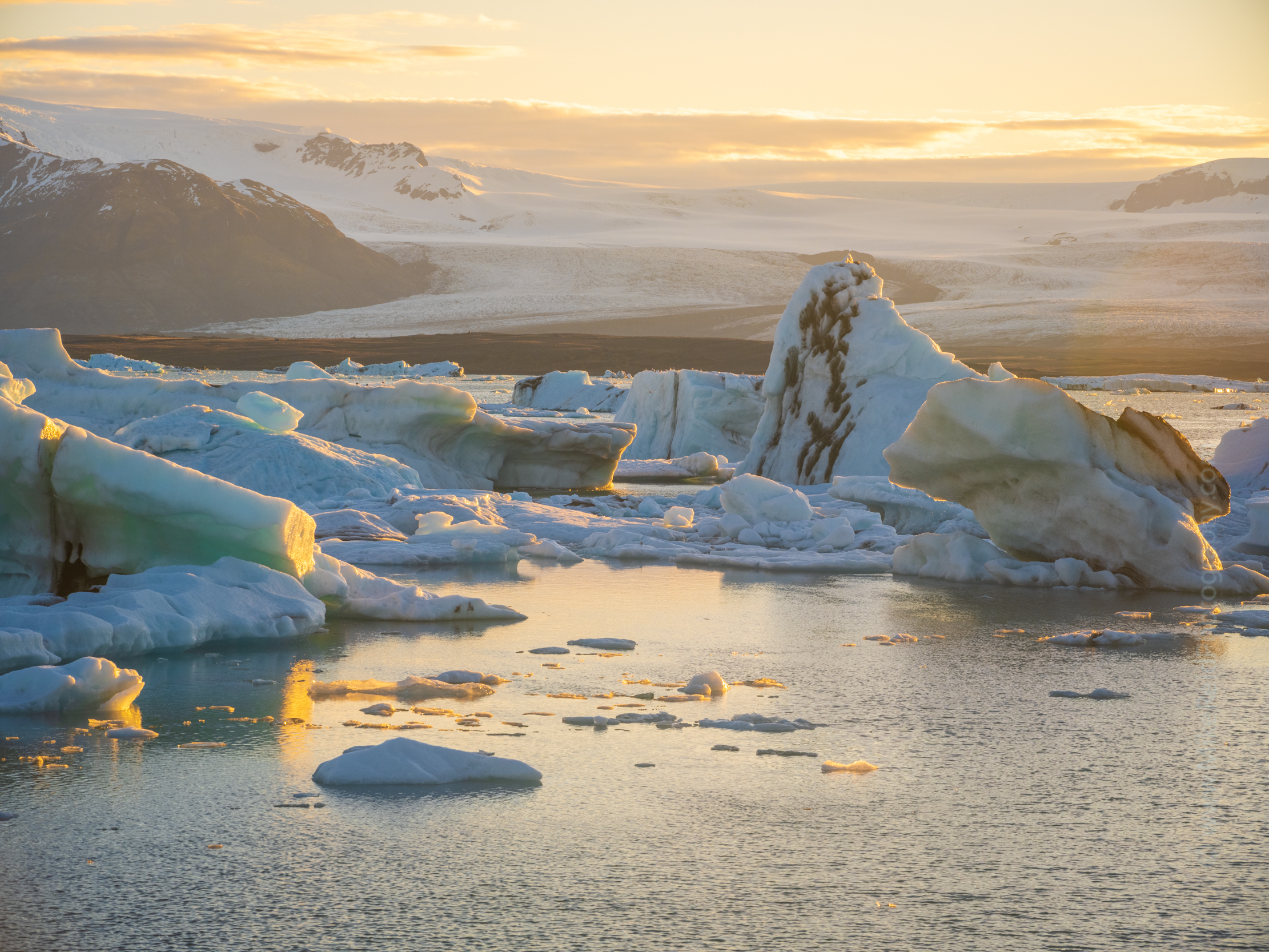 Golden sunset light illuminates floating icebergs in Iceland’s Jökulsárlón Glacier Lagoon, with Vatnajökull’s snowy expanse rising beyond. Captured by Mike Reid Photography, this serene moment blends warm evening tones with the cool blue of ancient glacial ice, creating a timeless scene of Iceland’s natural beauty and stillness.