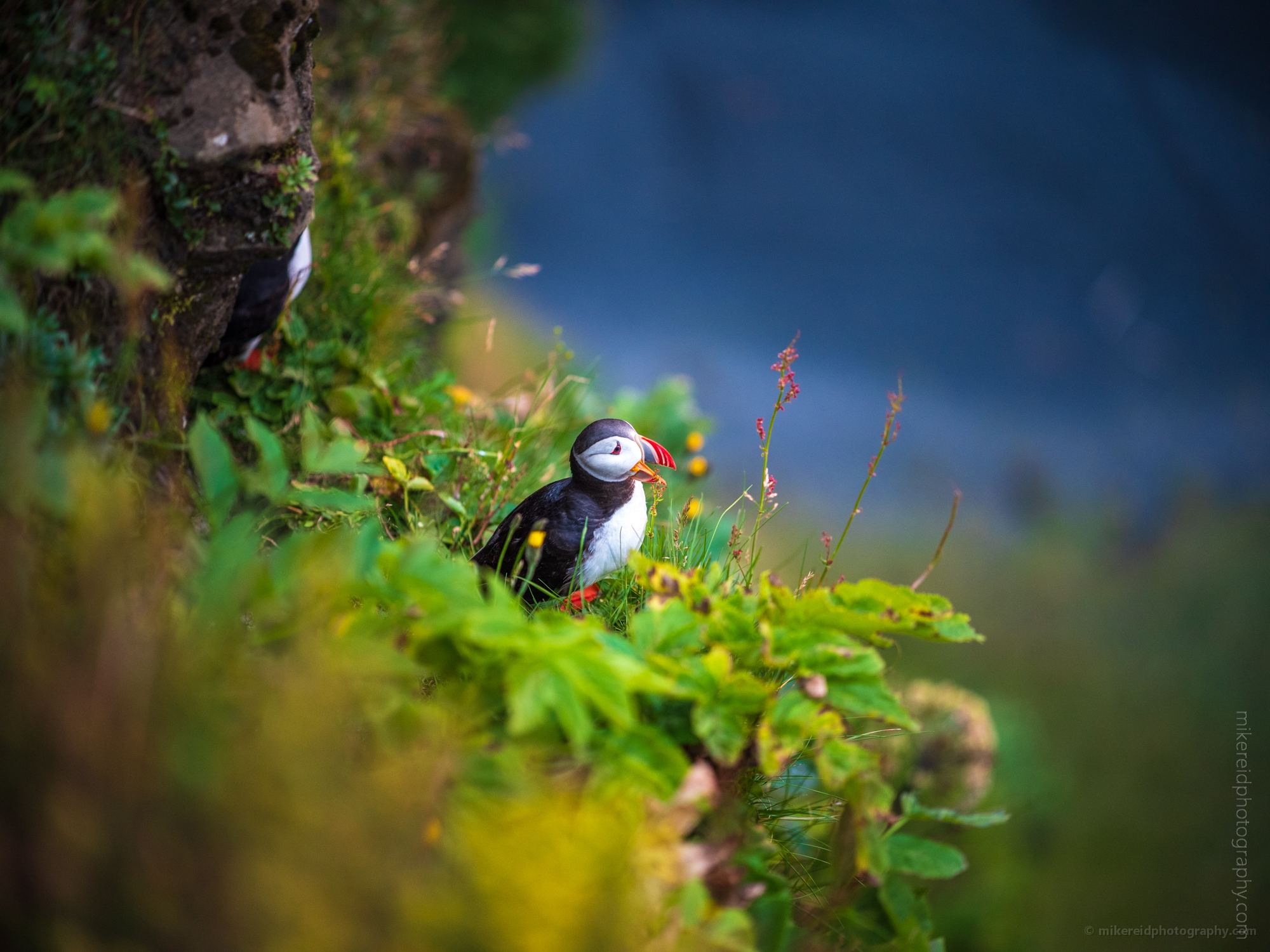 A lone puffin perches gracefully on a mossy cliff bathed in the warm hues of Iceland’s sunset. Captured with the Fuji GFX50s and Zeiss 135mm lens, this fine art wildlife photograph highlights the vivid contrast between the puffin’s colorful beak and the rugged coastal landscape.