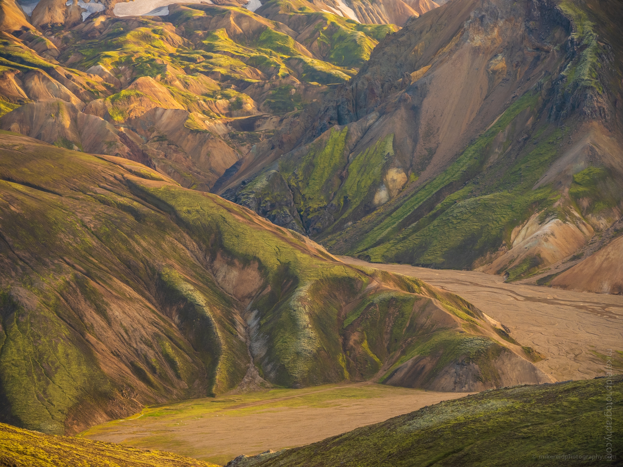 Golden light sweeps across the ridges of Iceland’s Landmannalaugar Highlands, illuminating layers of volcanic earth and moss-covered slopes. Captured with the Zeiss 100–300mm lens on the Fuji GFX50s, this image highlights the sculpted textures and color transitions that define Iceland’s surreal geothermal terrain. The hiking trails winding through these rhyolite mountains invite exploration and a sense of scale against the vast, untouched wilderness.