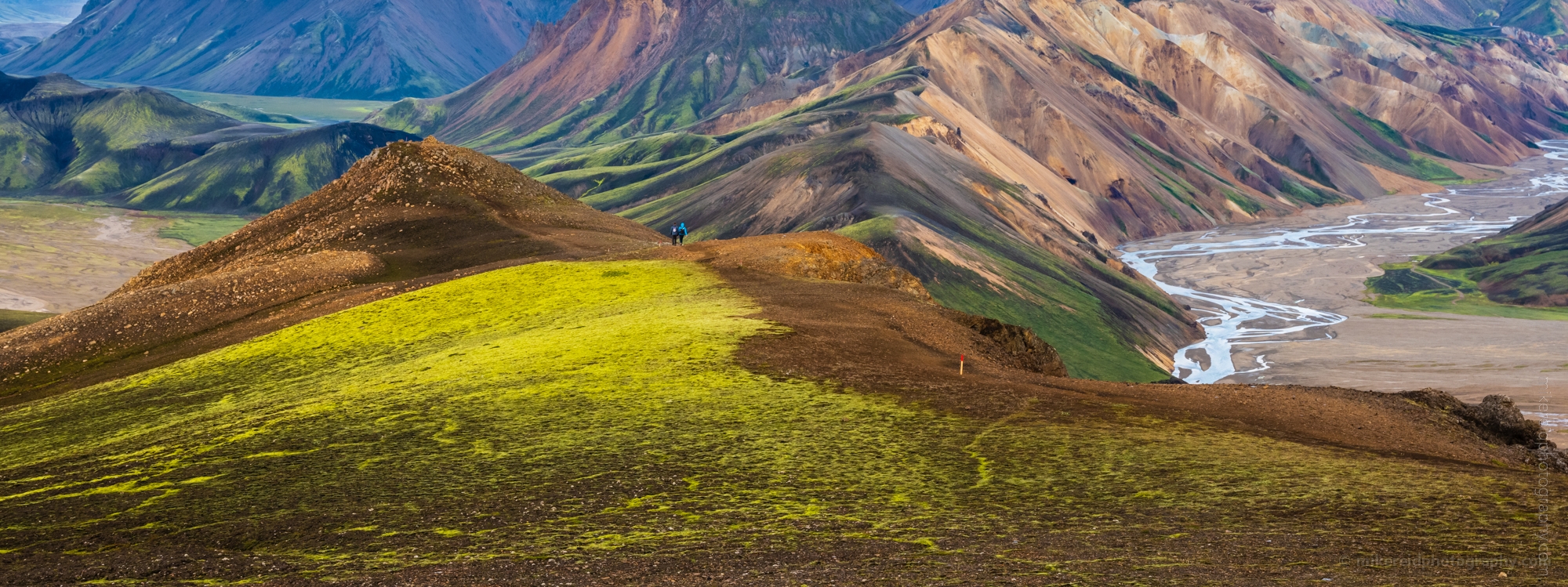 Vibrant green moss and colorful rhyolite peaks define the otherworldly landscape along the Súðurnámur hiking trail in Iceland’s Landmannalaugar region. Captured by Mike Reid Photography, this panoramic view reveals winding paths through volcanic ridges and the braided river valleys below — a striking display of Iceland’s raw, untouched beauty.