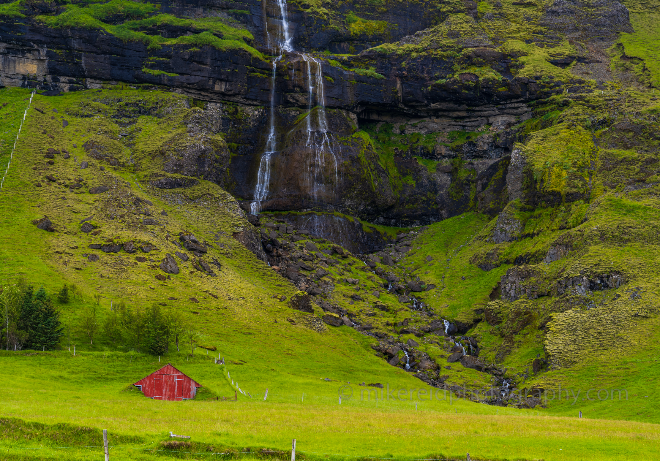 A striking red barn rests beneath a cascading waterfall and emerald-green cliffs along Iceland’s famous Ring Road. This classic Icelandic countryside view captures the harmony between rugged nature and rural simplicity. Photographed by Mike Reid Photography, the scene blends vibrant textures — mossy basalt rock, tumbling water, and a peaceful meadow — into a timeless composition of Iceland’s pastoral beauty.
