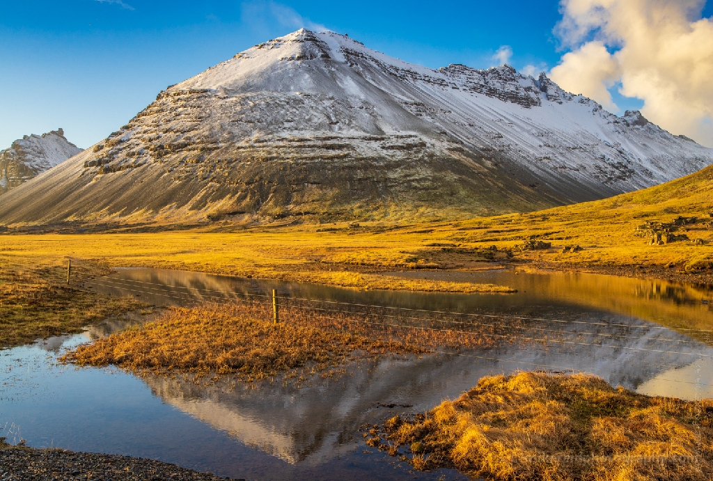 Warm sunlight bathes the snow-capped peaks and golden fields along Iceland’s Ring Road, creating a striking balance of color and contrast. The mountain’s reflection glows in a tranquil pool beneath the crisp blue sky, capturing the peaceful beauty of Iceland’s dramatic terrain. This fine art photograph embodies the essence of Icelandic light and landscape — bold, serene, and timeless.