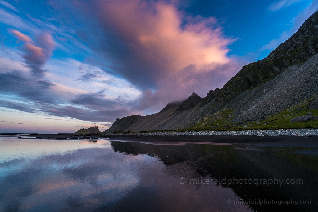 Soft dawn light illuminates the jagged peaks of Vestrahorn, mirrored in the still tidal pools along Stokksnes Beach in southeastern Iceland. The calm morning atmosphere, pastel clouds, and gentle reflections create a sense of peace and timeless beauty. Fine-art landscape photograph by Mike Reid capturing Iceland’s serene coastal light and mountain majesty at sunrise.