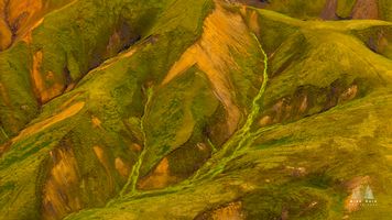 This striking aerial photograph captures the colorful rhyolite ridges of Iceland’s highlands, where mineral-rich mountains are streaked with vivid green moss and glowing orange earth. The natural patterns resemble veins of molten color flowing through the landscape, sculpted by geothermal forces over millennia. The mix of texture, tone, and light creates an abstract composition that feels both geological and painterly. A stunning fine art print that celebrates the surreal beauty of Iceland’s volcanic heartland.