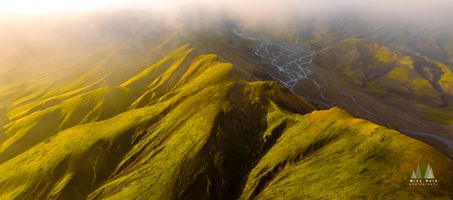 This stunning aerial photograph captures the sweeping ridges of Barmur near Landmannalaugar in Iceland’s southern highlands. Bathed in soft morning light and framed by low drifting mist, the emerald slopes and braided glacial rivers below reveal the intricate beauty of Iceland’s volcanic landscape. The interplay of light, color, and terrain creates a serene yet powerful composition that celebrates the wild heart of the highlands. A fine art print for collectors drawn to Iceland’s remote, untouched beauty.