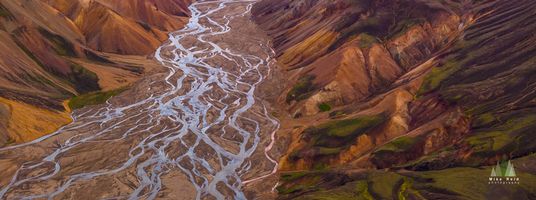 This stunning aerial photograph captures the Jökulgilskvísl River winding through the multicolored rhyolite mountains of Landmannalaugar, Iceland. Countless braided channels carve through the valley floor, reflecting soft light against the warm tones of red, orange, green, and gold. The vivid geology and intricate waterways together form a natural masterpiece, perfectly showcasing the dynamic beauty of Iceland’s highlands. A fine art print that brings the energy, color, and spirit of the Icelandic wilderness into your space.