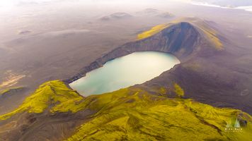 An ethereal aerial photograph of a crater lake deep in the Icelandic Highlands, where turquoise water rests within dark volcanic slopes dusted with bright green moss. The soft morning light enhances the contrast between the stark lava fields and the gentle hues of the lake, creating a scene both peaceful and powerful. Blood Craters are beyond.