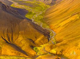 An aerial view of a winding moss-covered canyon deep in the Icelandic Highlands, where glacial streams carve luminous paths between golden rhyolite slopes. The subtle network of remote F-roads weaves through the volcanic landscape, hinting at the adventurous routes that lead into Iceland’s raw and untouched wilderness. Bathed in warm highland light, this image captures the vivid textures, solitude, and natural artistry of one of Iceland’s most remote regions. A striking fine art print that celebrates the wild harmony between land, water, and color.