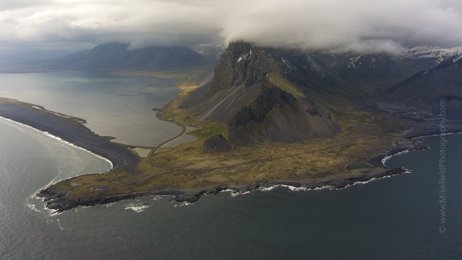 A dramatic aerial view of Iceland’s Hvalnes Peninsula, where dark coastal waters meet rugged volcanic cliffs under heavy storm clouds. The moody light, mist-covered peaks, and winding coastline capture the untamed power and beauty of Iceland’s southeastern coast. Photographed by Mike Reid Photography, this image reveals the raw drama of Iceland’s weather and landscape from above.