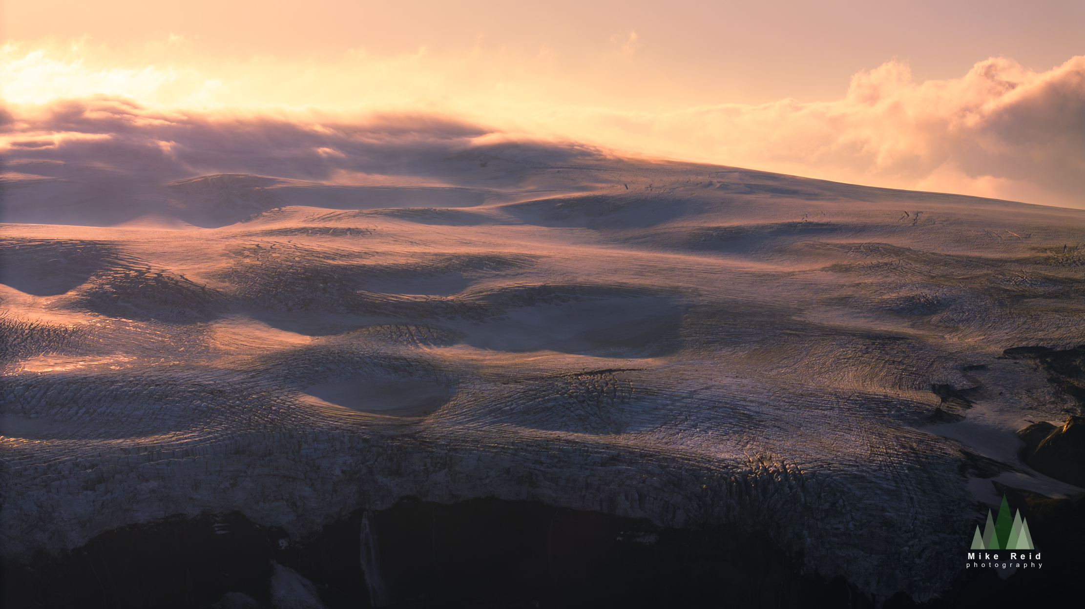 A telephoto drone capture of Iceland’s Mýrdalsjökull Glacier, revealing intricate layers of ice, crevasses, and flowing textures carved by time and pressure. Shot at 168mm, this detailed aerial showcases the glacier’s subtle hues of lavender, blue, and shadow as the morning light brushes across the frozen expanse.