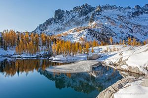 Golden larches, a layer of snow and a clear reflection make this a beautiful scene at Leprechaun Lake in the Enchantments.