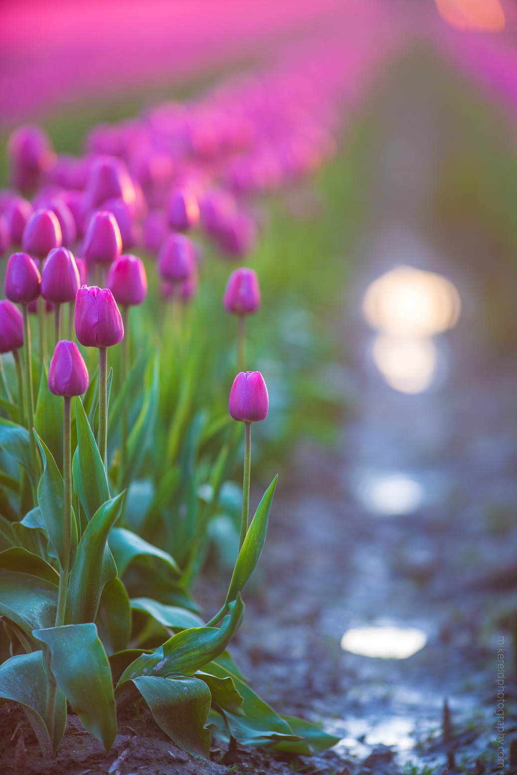 Skagit Valley Tulip Festival Sunlit Magenta Tulips Row and Water Canon 80-200mm.jpg