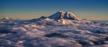 View from the air of Rainier, Adams, St Helens and Hood around sunset