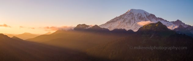Mount Rainier Aerial Photography Tatoosh Range Dusk Glow Sunrays Panorama