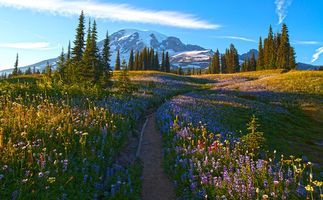 A sunlit trail winds through vibrant wildflower meadows beneath the towering peak of Mount Rainier, captured in stunning detail with a Sony A7R II. Lupine, paintbrush, and alpine daisies fill the fields, celebrating summer’s bloom in this Pacific Northwest paradise.