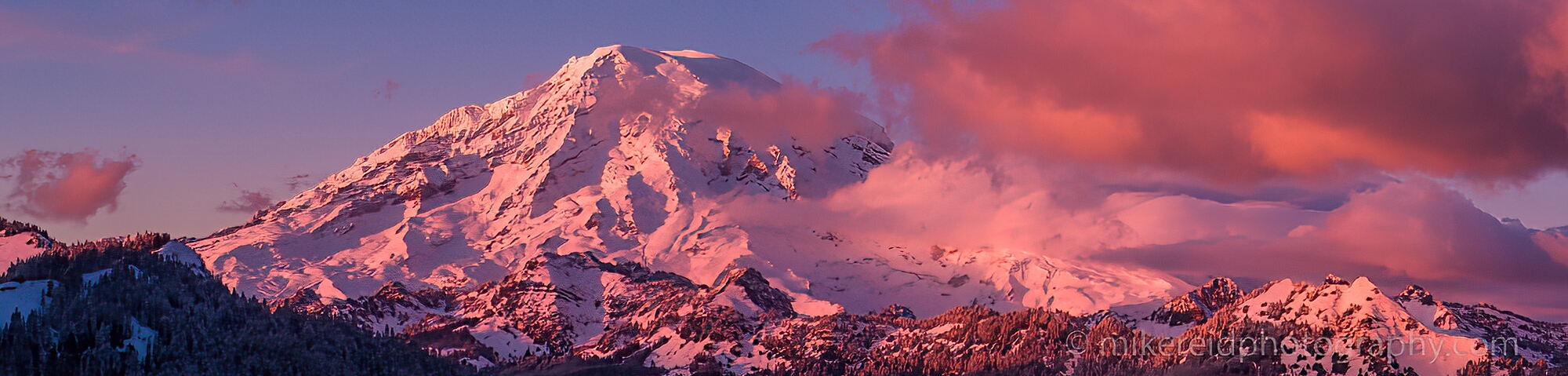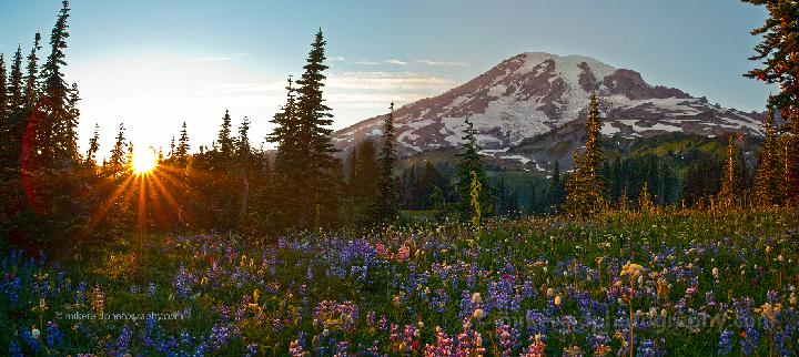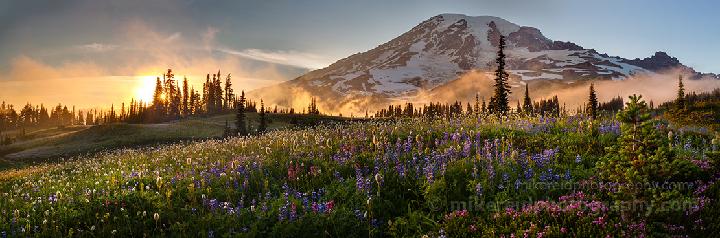 Mount Rainier Sunrise Panorama over Wildflower Meadows