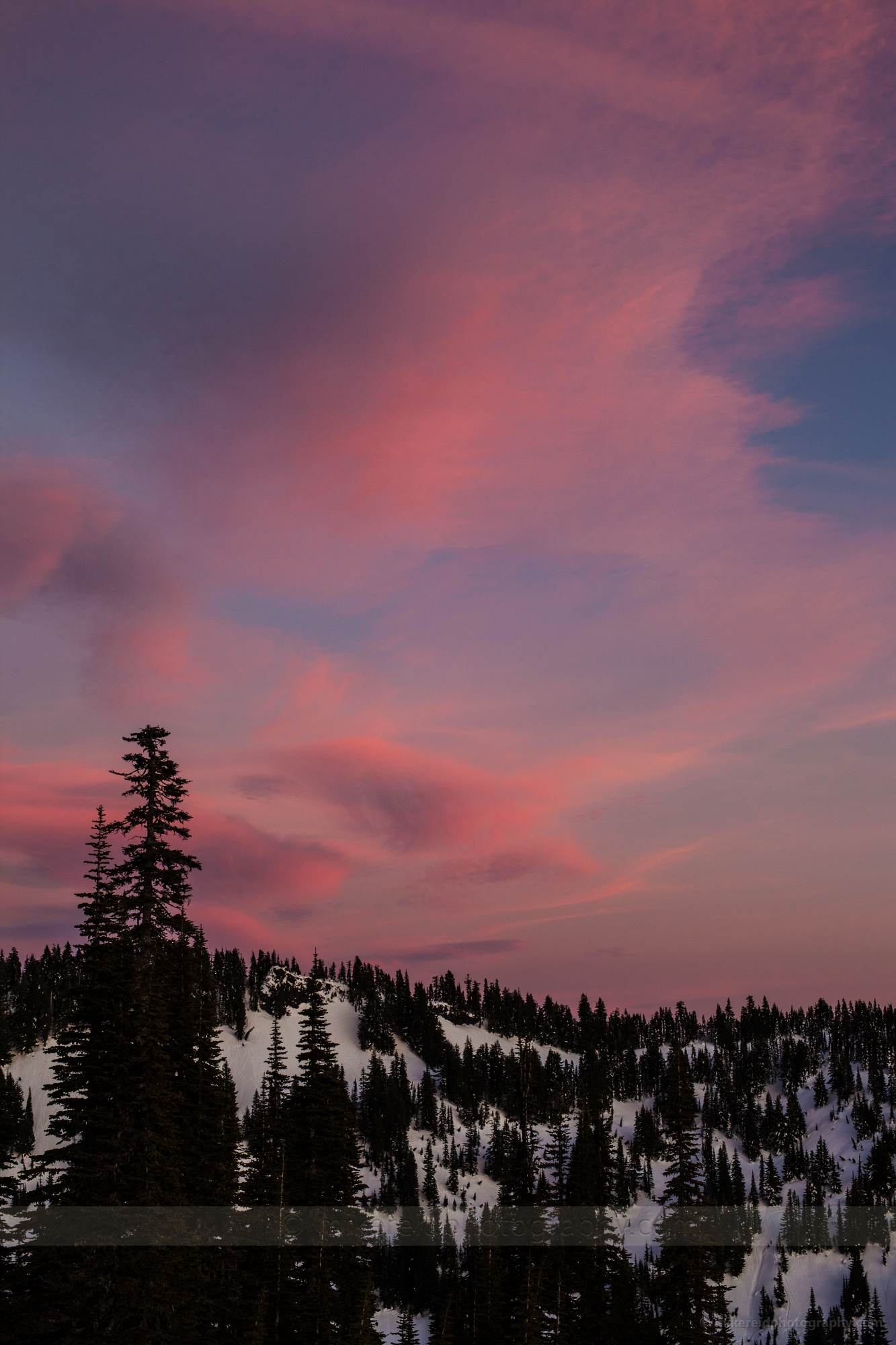 Brilliant pink and violet clouds drift above snow-covered Mazama Ridge at Mount Rainier National Park as day fades into twilight. The alpine evergreens and soft evening glow capture the peaceful beauty of the Cascades in spring. A serene and colorful Pacific Northwest mountain landscape, perfect for fine art prints and wall décor that celebrate the quiet magic of sunset in Rainier’s high country.