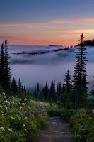 Soft sunset light spills over a misty alpine meadow filled with wildflowers on the trail descending to Paradise in Mount Rainier National Park. Layers of fog drift through the evergreens as pink and orange hues glow above the Cascade ridges—a tranquil Pacific Northwest mountain evening.