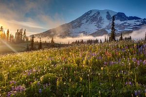 Warm evening light bathes a vibrant wildflower meadow beneath Mount Rainier, as sunbeams stream through mist rising from the slopes. Captured in golden hour glow, this Pacific Northwest alpine landscape embodies the fleeting beauty of summer in Mount Rainier National Park.
