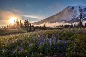 Golden evening light breaks through drifting fog around Mount Rainier, illuminating vibrant wildflower meadows below the mountain’s glaciers. Captured in Mount Rainier National Park, this peaceful moment reveals the delicate balance of light, mist, and alpine beauty that defines the Pacific Northwest summer.