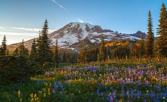 The evening sun bathes Mount Rainier’s Paradise meadows in golden light, illuminating vibrant lupine and paintbrush wildflowers beneath the mountain’s glaciated slopes. Captured during peak bloom, this serene summer moment showcases the breathtaking alpine beauty of Mount Rainier National Park at golden hour.